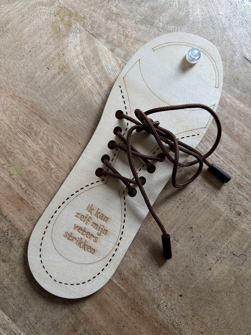 Leer op een speelse en duurzame manier veters strikken! Dit set bevat een houten schoen met uitgesneden gaatjes, stevig paracord en een houten medaille als beloning. Perfect voor kinderen vanaf 4 jaar.